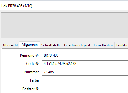 Die naheliegendste Variante ist es, die einmalige Identifikationsnummer des Tags zu verwenden. Bei den von mir verwendeten Tags aus der Gruppe „NTAG2xxt“ ist das eine Gruppe von 7-Bytes, UID genannt (für Unique IDentifier). Es besteht natürlich keinen Zusammenhang zwischen Fahrzeugtype und UID. Die muss im Modellbahnsteuerprogramm festgelegt werden, indem man die 7 Stellen abschreibt und als „Code“ für ein bestimmtes Fahrzeug eintippt. Hier ein Beispiel aus der Zeit, als ich die Lok-ID noch über LocoNet eingelesen haben. Die Tag UID lautete 04:97:0F:4A:62:3E:84, also eine hexadezimale Darstellung wie bei der Mac-ID einer Netzwerkkarte. Rocrail verlangte die dezimale Darstellung dieser UID als 4.151.15.74.98.62.132. Separat dazu muss bei einem DCC Fahrzeug auch noch eine Adresse eingetragen werden.