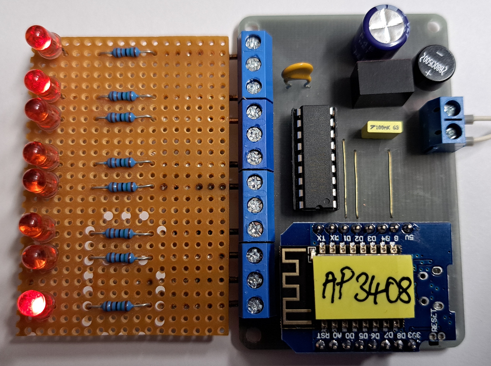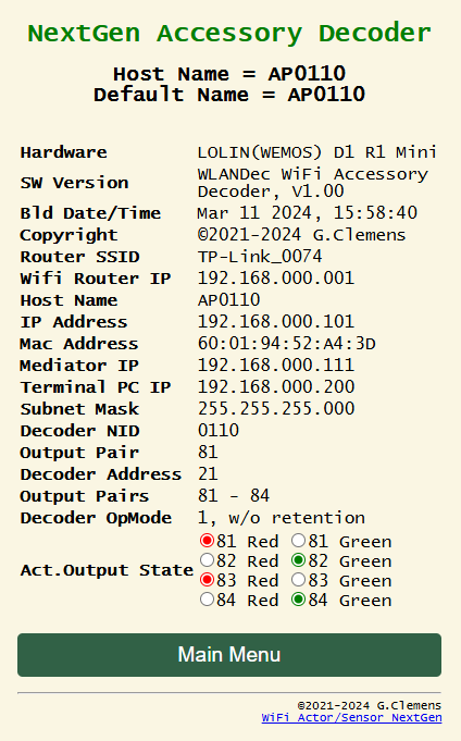 Die NID, die Network Identification Nummer, die bei allen CAN-Rückmeldern bisher benötigt wurde, wird eigentlich für einen Zubehördecoder nicht benötigt. Der Decoder wird über die zugewiesene Decoderadresse eindeutig definiert. Damit man ihn über das Web-Interface einfach konfigurieren kann, benötigt er aber einen Hostnamen. Ich habe dafür weiterhin die NID verwendet, wieder mit dem Präfix ‚AP‘. Der Decoder aus der obigen Abbildung präsentiert sich deswegen heute mit „AP3408“.