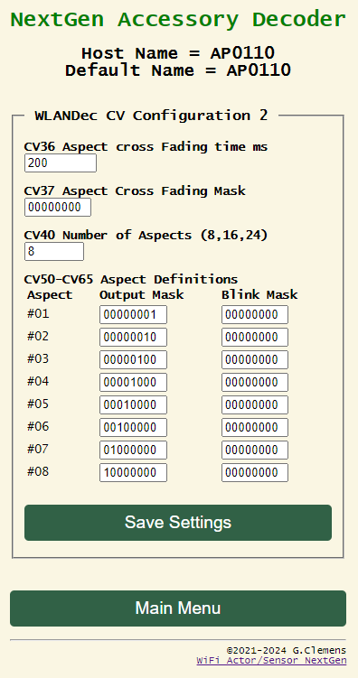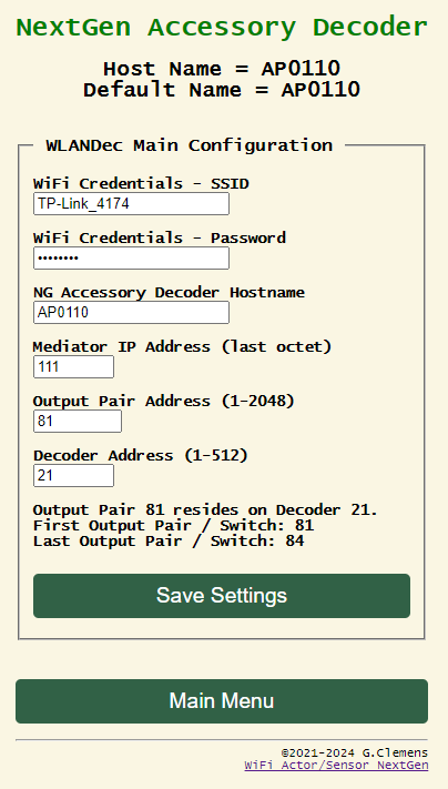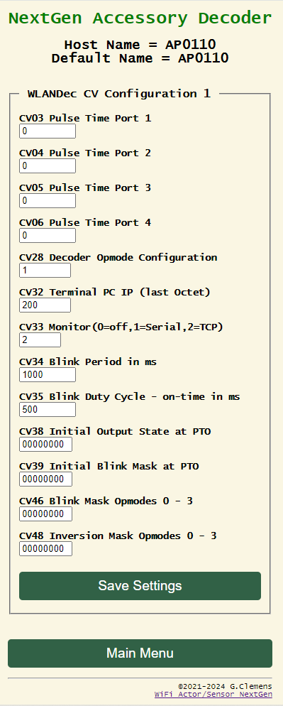 Der WLANDec wird über eine Decoderadresse oder eine Weichenadresse („Output Pair Address“) definiert. Aus einer Decoderadresse werden sofort die zugehörigen Weichenadressen berechnet und aus einer Weichenadresse wird sofort der passende Decoder identifiziert und angezeigt. Man muss nur kurz „Save Settings“ klicken. Wie üblich wird die Decoderadresse in CV001 und CV009 gespeichert. Sie wird parallel dazu nach CV017 und CV018 exportiert, damit z. B. Rocrail mit dem Programmiertool auf den Decoder zugreifen kann. In CV019 und CV020 wird die erste Weichenadresse des Decoders gespeichert.